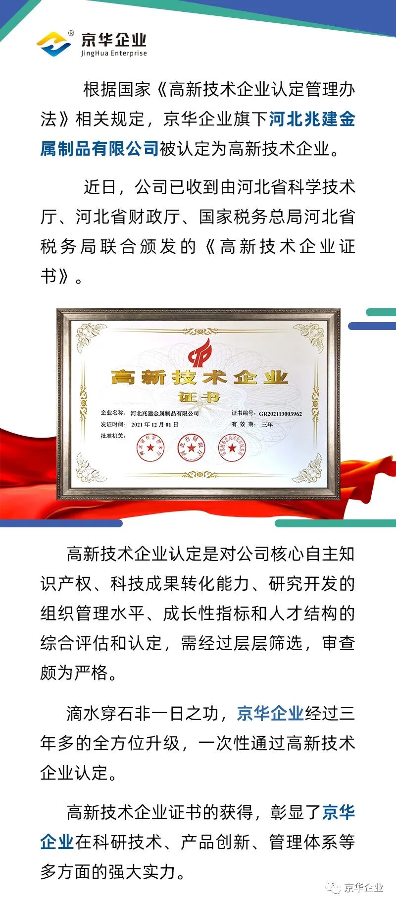 喜訊!熱烈祝賀京華企業(yè)斬獲“高新技術(shù)企業(yè)證書”!