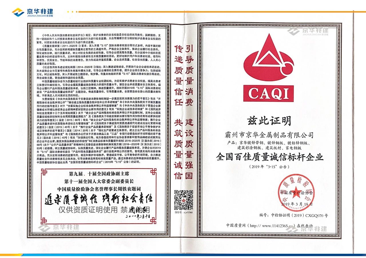 霸州京華金屬制品有限公司作為一家專業(yè)生產(chǎn)冷軋帶鋼、鍍鋅帶鋼、鋅鋁鎂帶鋼、冷軋鋼板、鍍鋁鋅鋼板、彩涂鋼板的現(xiàn)代化民營企業(yè),自創(chuàng)立以來,始終堅持創(chuàng)新,不斷擴大生產(chǎn)規(guī)模,通過了質量管理體系ISO9001認證、歐盟CE認證等多項權威認證,且榮獲了“全國百佳質量誠信標桿企業(yè)”、“中國建材企業(yè)50強”、“重合同守信用企業(yè)”等多項榮譽。