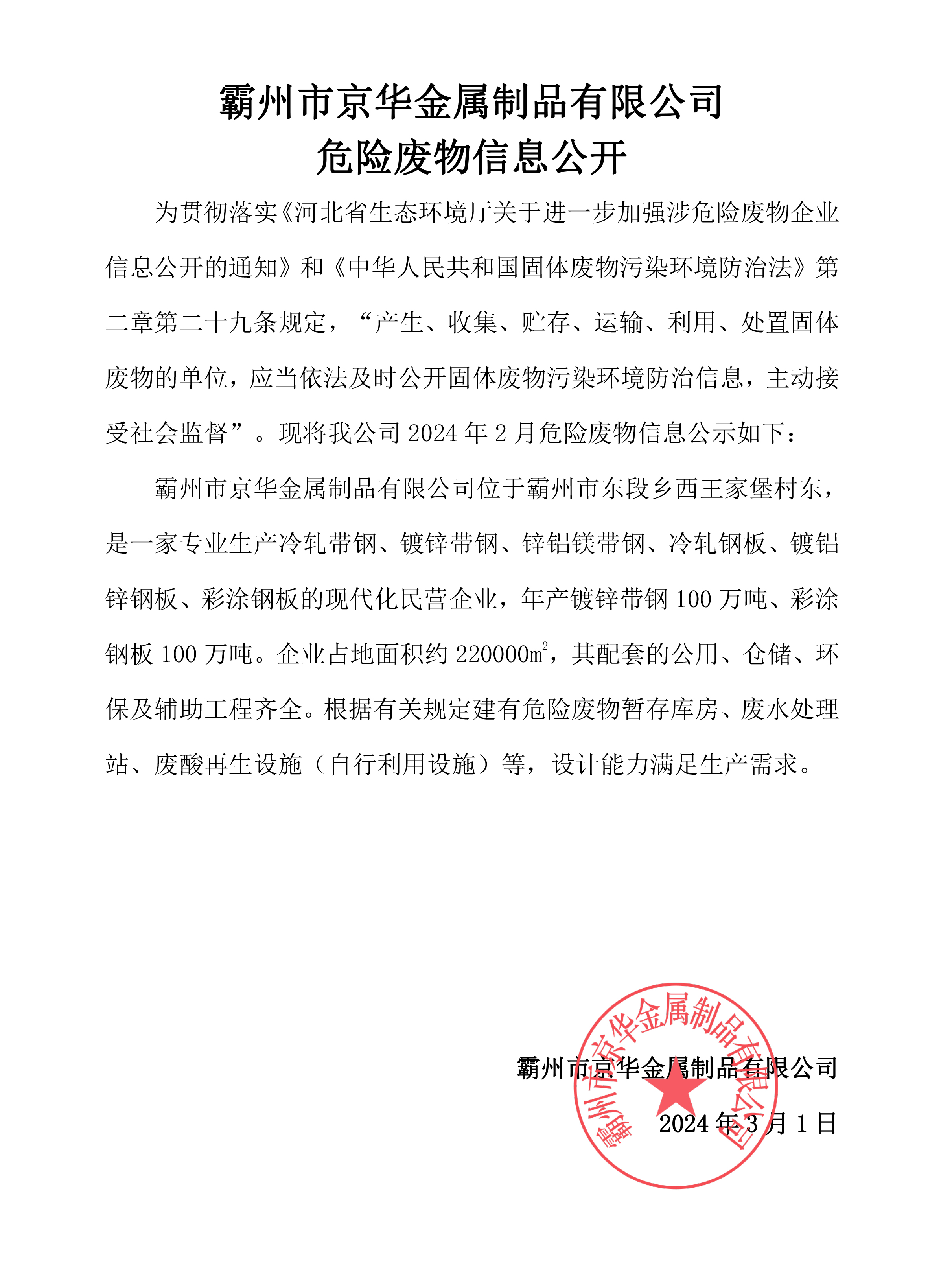 24年2月危險廢物信息公開-霸州市京華金屬制品有限公司