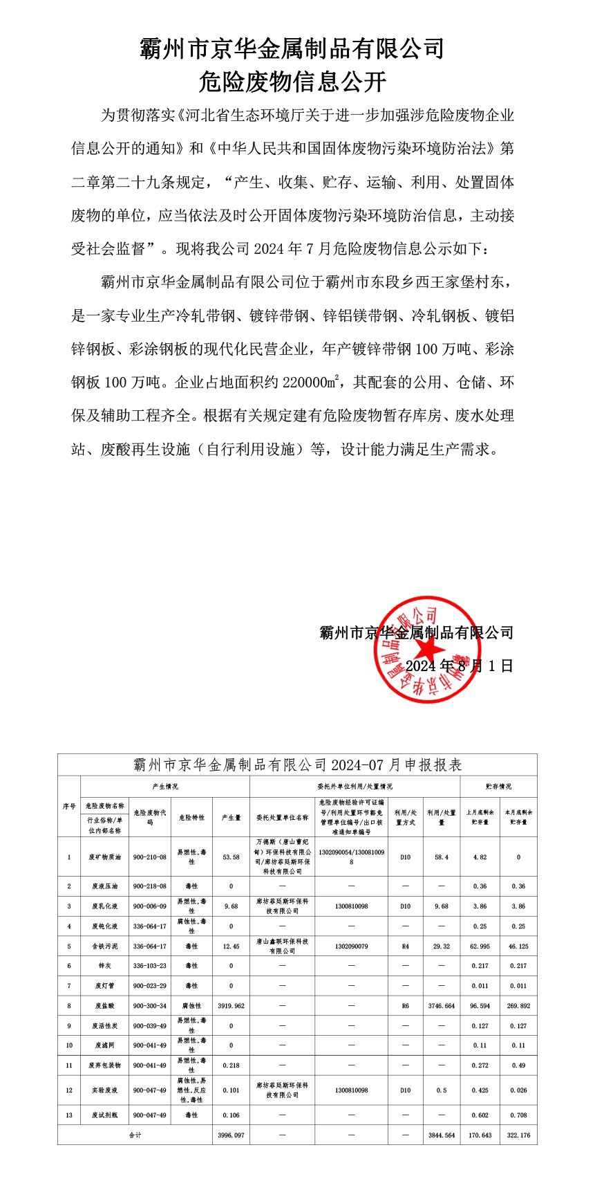 下一條:24年8月危險(xiǎn)廢物信息公開-霸州市京華金屬制品有限公司