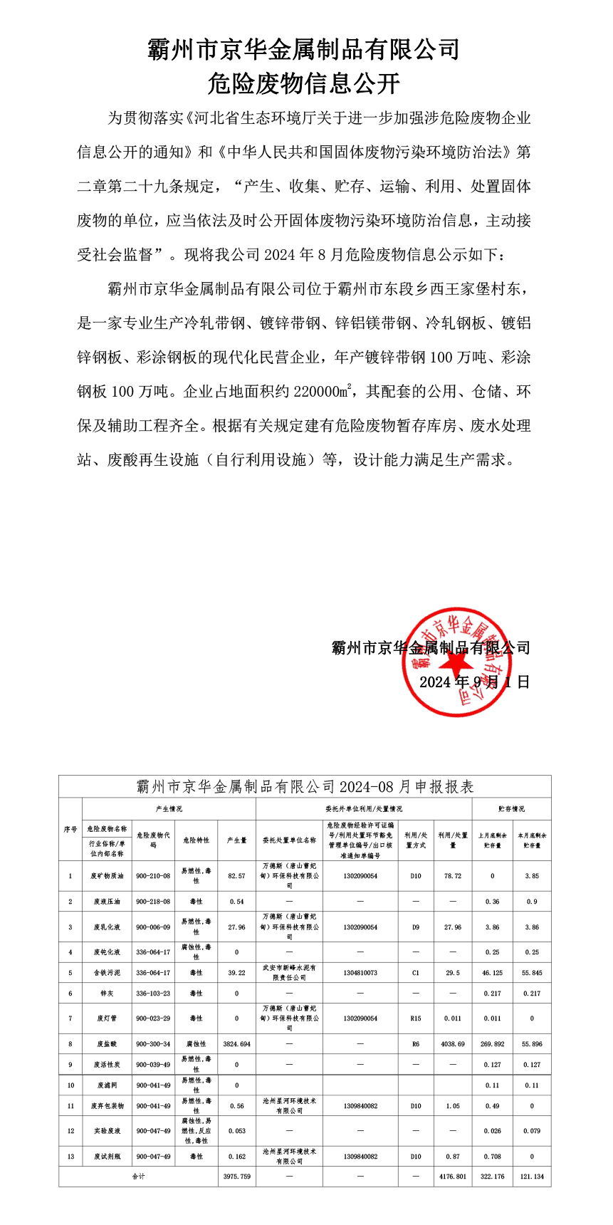24年8月危險廢物信息公開-霸州市京華金屬制品有限公司
